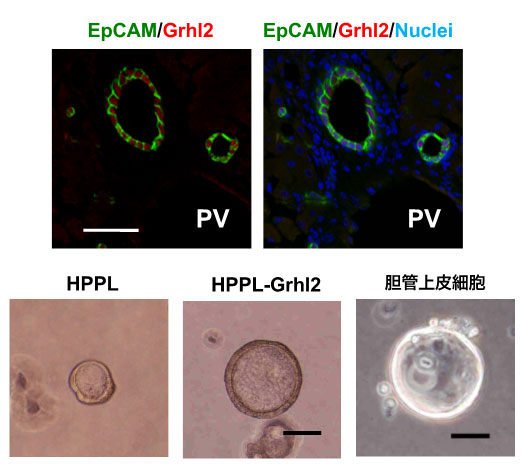 Grhl2は、管状構造を形成する胆管上皮細胞に特異的に発現している。HPPLにGrhl2を導入すると、管腔が大きく発達する。成体肝臓からEpCAM陽性細胞として分離した胆管上皮細胞も、3次元培養において管腔構造が発達したCystを形成する。Scale bars; 50 μm