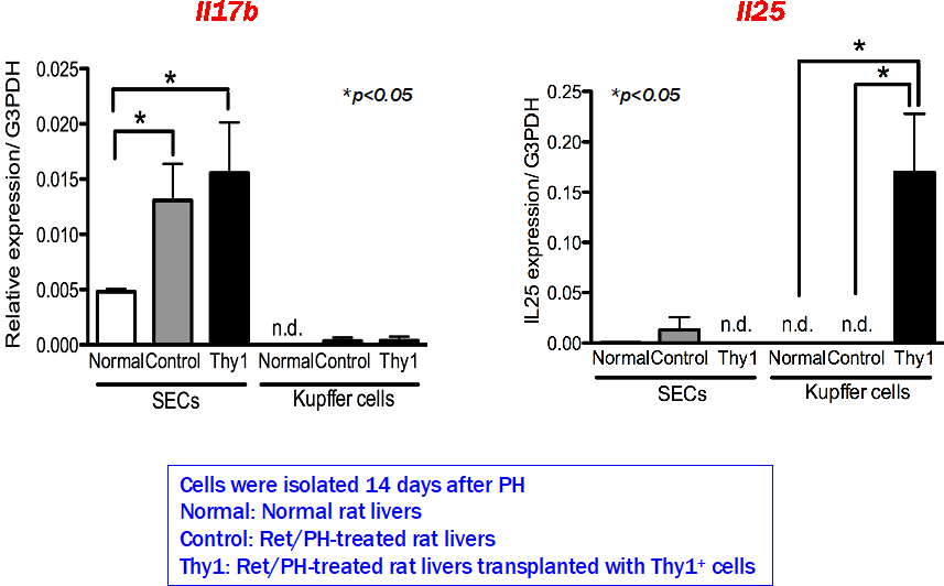 IL17RBシグナルがSHPCの増殖に重要な働きをしていると考えられた。IL17RBのリガンドとしてIL17BとIL25がある。それぞれのサイトカインを産生している細胞を調べると、IL17Bは類洞内皮細胞が、IL25はマクロファージ(Kupffer細胞)が産生していることが分かった。