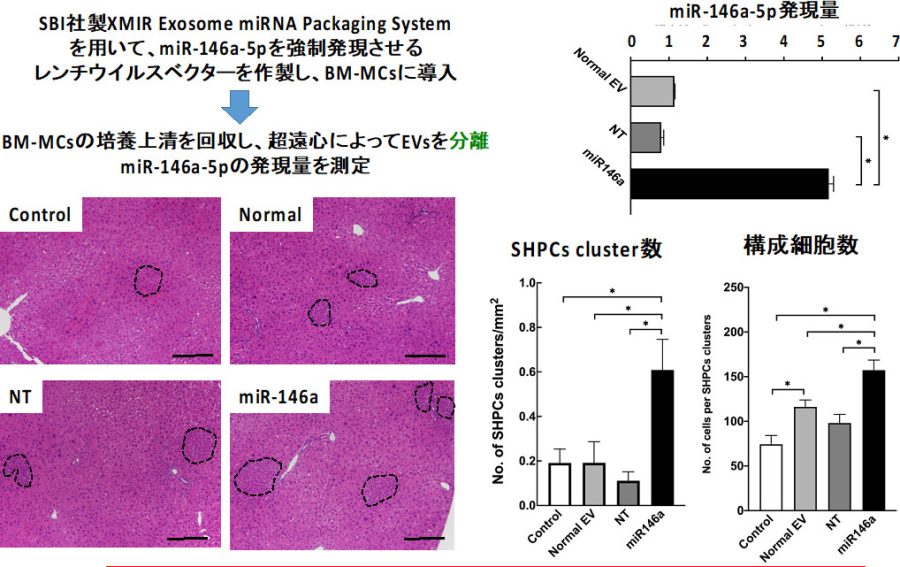miR-146a-5p含有量が5倍増えたEVsをRet/PHモデルラット肝臓に投与し、2週間目の肝臓に出現するSHPC clustersを計測した。miR-146a-5pを強制発現したBM-MCsの産生するEVsを投与した肝臓におけるSHPC cluster数は有意に増加し、Clusterも大きくなった。